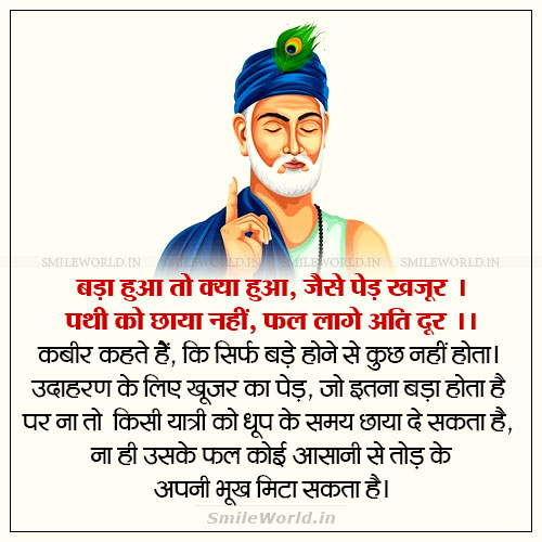 कबीर कहते हैं, कि सिर्फ बड़े होने से कुछ नहीं होता। उदाहरण के लिए खूजर का पेड़, जो इतना बड़ा होता है पर ना तो किसी यात्री को धूप के समय छाया दे सकता है, ना ही उसके फल कोई आसानी से तोड़ के अपनी भूख मिटा सकता है।
