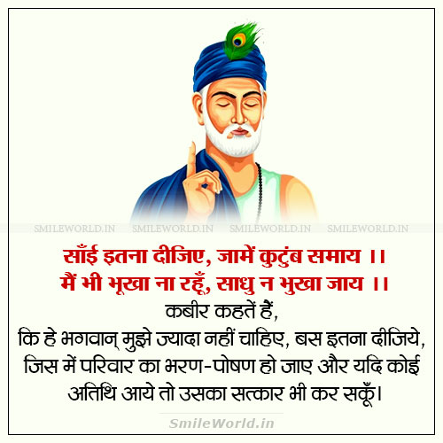 कबीर कहतें हैं, कि हे भगवान् मुझे ज्यादा नहीं चाहिए, बस इतना दीजिये, जिस में परिवार का भरण-पोषण हो जाए और यदि कोई अतिथि आये तो उसका सत्कार भी कर सकूँ।