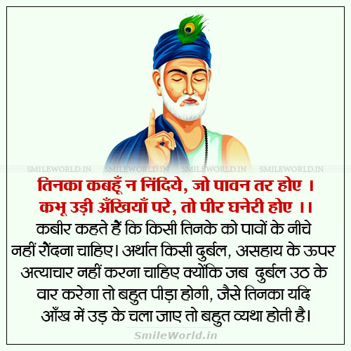 कबीर कहते हैं कि किसी तिनके को पावों के नीचे नहीं रौंदना चाहिए। अर्थात किसी दुर्बल, असहाय के ऊपर अत्याचार नहीं करना चाहिए क्योंकि जब दुर्बल उठ के वार करेगा तो बहुत पीड़ा होगी, जैसे तिनका यदि आँख में उड़ के चला जाए तो बहुत व्यथा होती है।